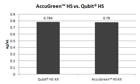 The AccuGreen™ High Sensitivity dsDNA Quantitation Kit is designed for use with handheld fluorometers such as the Qubit® fluorometers from Thermo Fisher Scientific.