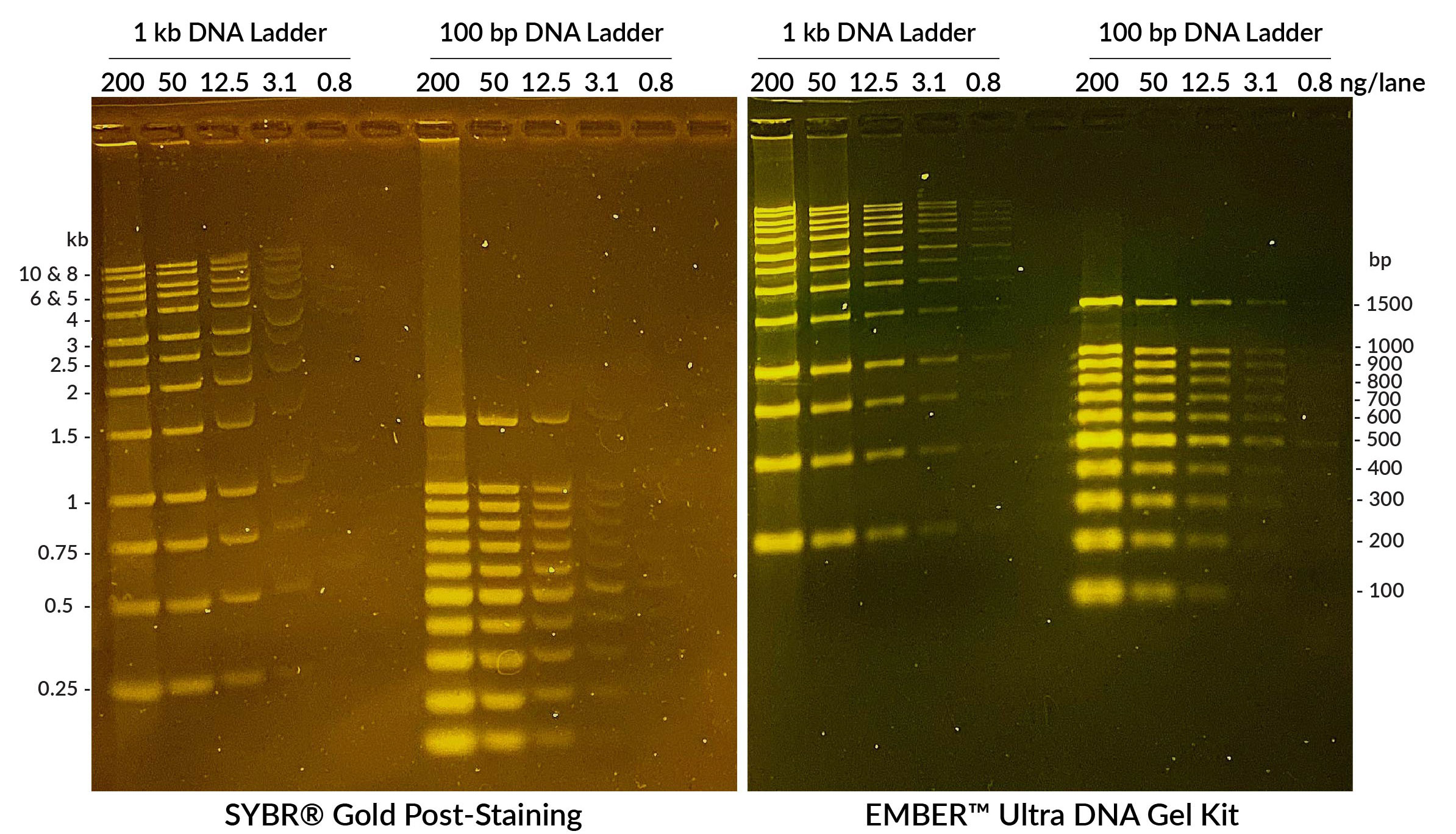 The EMBER™ Ultra DNA Gel system provides the highest sensitivity and resolution for DNA among currently available agarose gel stains without the need for a post-electrophoresis staining step. Simply cast your agarose gel using the EMBER™ Ultra Precoated Agarose, and prepare your samples in the EMBER™ Ultra DNA Loading Dye. Bands can be imaged immediately after electrophoresis.