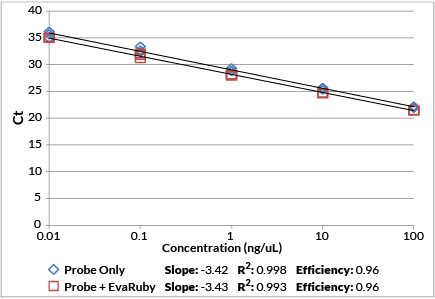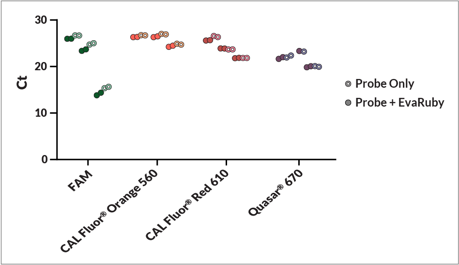 Dye-based qPCR has low target specificity but has the advantage of performing a rapid and facile confirmation of results with melt curve analysis. On the other hand, probe-based qPCR benefits from high target specificity but is not compatible with melt curve analysis. Instead, confirmation of the qPCR results is often done by gel electrophoresis, a labor-intensive step that increases the time to results. Using EvaRuby™ in combination with probe-based qPCR enables the use of probe for high target specificity together with an intercalating dye for melt analysis and confirmation of results. Furthermore, because EvaRuby™ signal is independent from probe signal, it acts as an internal control for PCR amplification. For example, despite successful amplification, a degraded or suboptimal probe may fail to bind to the amplified target sequence and as a result, qPCR would incorrectly report amplification failure. However, with EvaRuby™ present, amplification would still be detected during qPCR and can be identified with melt curve analysis.