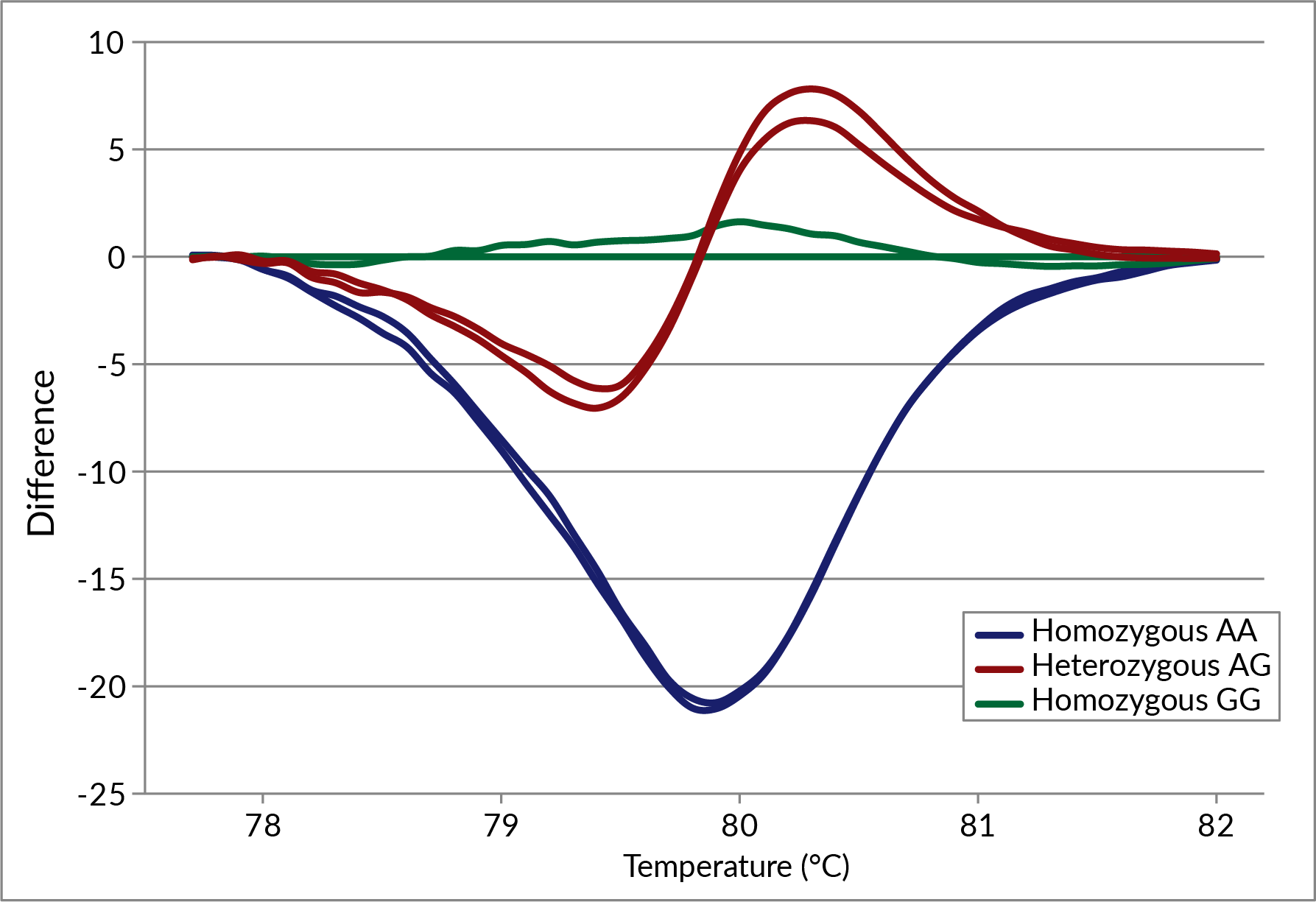 While EvaRuby™ can be used as a traditional intercalating qPCR dye to perform real-time qPCR, melt curve analysis, LAMP, and HRM®, the dye’s main advantage is that it can be incorporated into probe-based qPCR assays. Unlike other intercalating dyes, EvaRuby’s™ unique spectral properties allow it to be combined with commonly used fluorescent qPCR probes with little cross-talk in other fluorescence channels. The dye can be added to the reaction mix during reaction setup without affecting probe specificity (Figures 1, 2) while expanding the capabilities of probe-based qPCR to include real-time troubleshooting and post-qPCR high-resolution melt analysis (Figure 3). Note that for traditional single-color dye-based qPCR, we still recommend using EvaGreen® Dye.