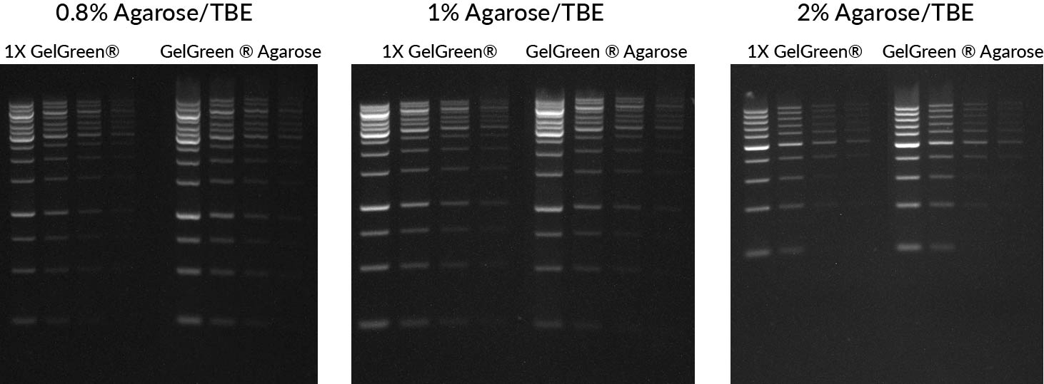 GelGreen® Agarose LE has low electroendosmosis (EEO) for high electrophoretic mobility. This agarose has excellent performance for analytical or preparative nucleic acid electrophoresis and blotting. It is suitable for preparing 0.8%-2% gels in TAE or TBE buffer. In a 1% GelGreen® Agarose gel, the final GelGreen® concentration is 1X, just like in our standard precast protocol. GelGreen® Agarose also gives excellent results at percentages between 0.8% (0.8X GelGreen®) up to 2% (2X GelGreen®).