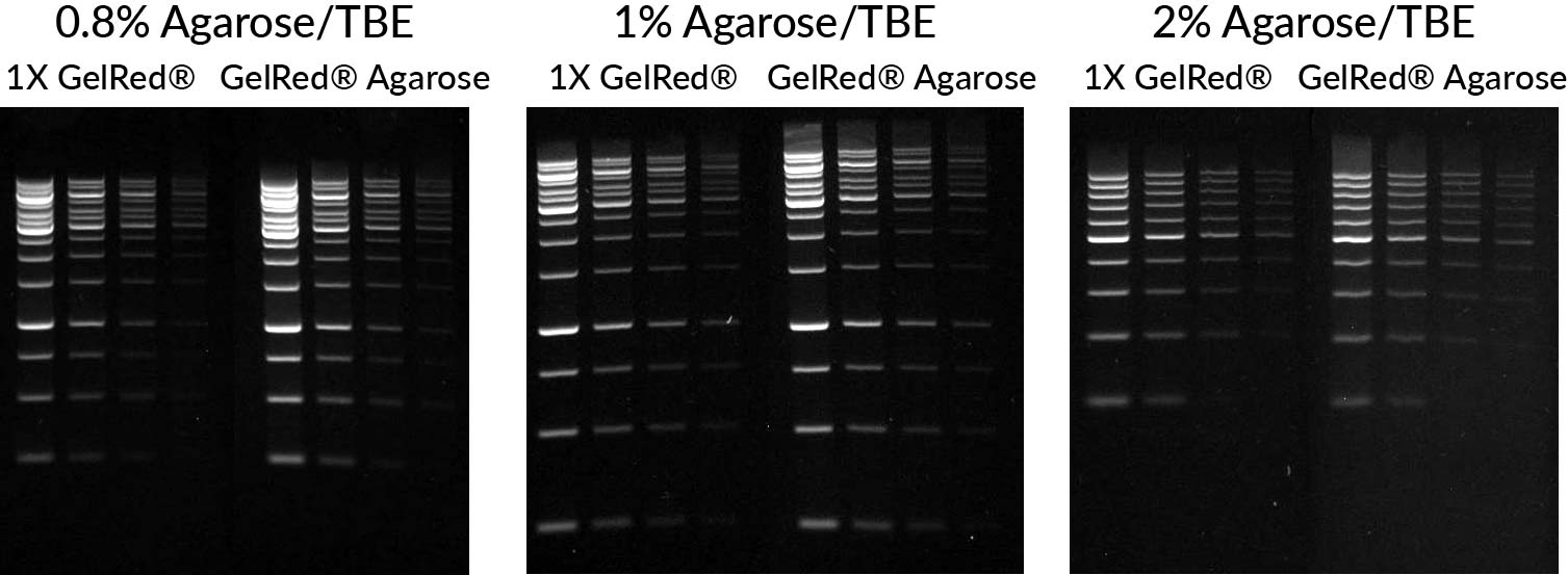 | Post-electrophoresis staining with GelRed® 10,000X in water or GelGreen® 10,000X in water - or - GelRed® 3X in water | No fluorescent dye is added to the gel, it is stained in 3X GelRed® or 3X GelGreen® solution after electrophoresis | • Most accurate sizing/sharpest bands • Staining solution can be re-used • Enhance sensitivity by adding NaCl | Extra staining step (up to 30 minutes) after electrophoresis (some customers report good results after only 5 minutes if dye is not reused) | • Highly accurate band sizing • Gels with more than ~100 ng DNA per band • Analyzing restriction digests |