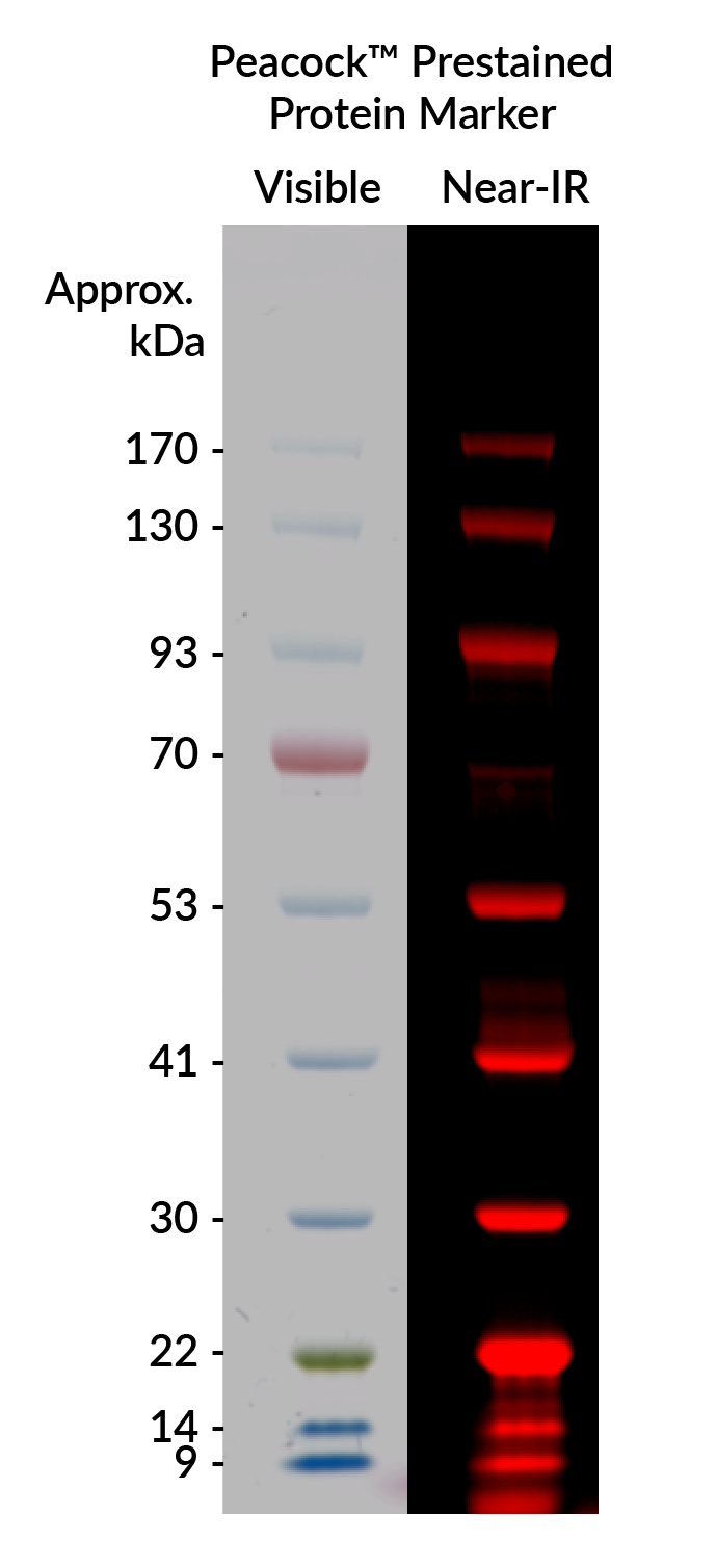 Peacock™ Prestained Protein Marker is a three-color protein ladder that allows you to visually monitor protein separation during SDS-PAGE or protein transfer to membranes for western blotting. We also offer Peacock™ Plus Prestained Protein Marker, a three color marker with 12 bands ranging from 8 kDa to 245 kDa.