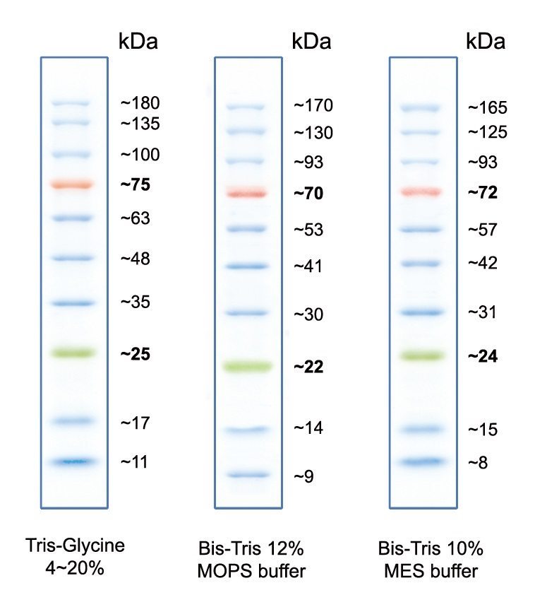 The Peacock™ Prestained Marker contains a total of 10 visible bands. This includes 8 blue bands ranging from 10 kDa to 180 kDa, plus a red band at 75 kDa and green band at 25 kDa for easy band identification. Peacock™ Prestained Protein Marker is ready to load with no heating or other preparation needed. Recommended loading is 3-5 uL per well for mini-gels.
