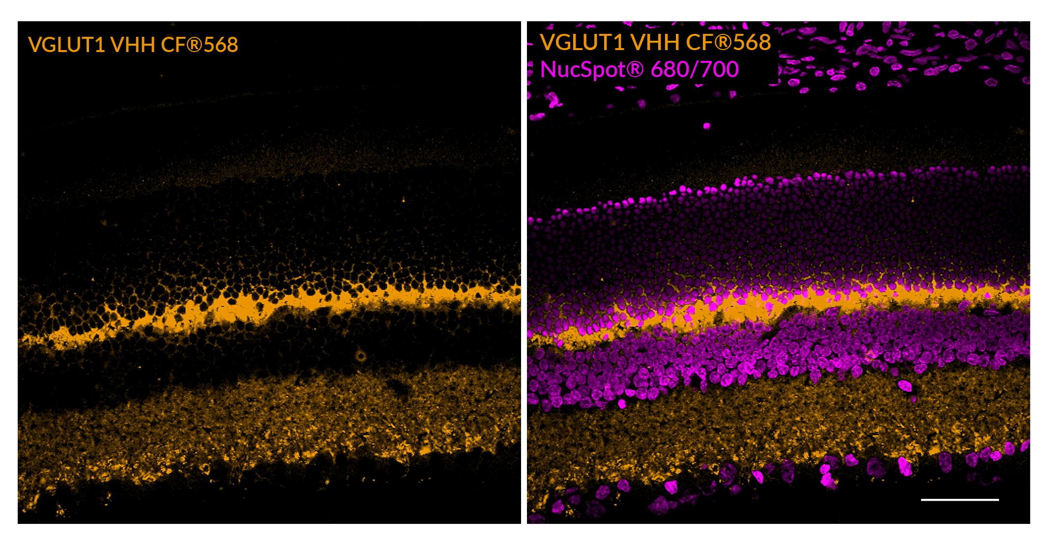 VGLUT1 Recombinant Alpaca VHH (SdAb2412.VGLUT1) recognizes the vesicular glutamate transporter 1 (VGLUT1) expressed during neurotransmission. This high-affinity single-domain antibody (SdAb), also known as camelid VHH or Nanobody®, is part of our MiniMab™ series of highly optimized conjugated probes. The SdAb has been validated for immunofluorescence microscopy and is available conjugated to CF® Dyes.