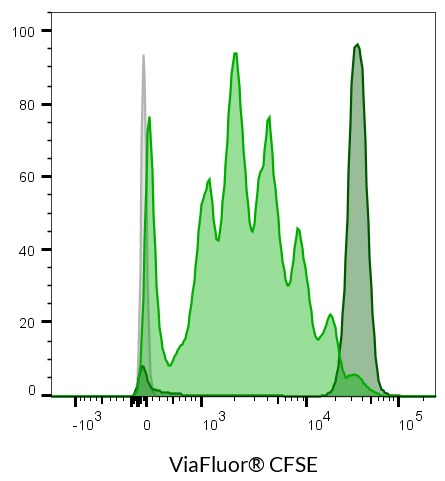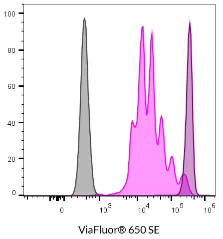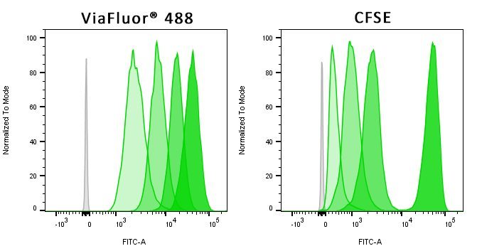 ViaFluor® SE dyes are membrane-permeant compounds that are initially non-fluorescent esters, but are converted to fluorescent dyes by intracellular esterases and will covalently react with amine groups on intracellular proteins at the same time, forming fluorescent conjugates that are retained in the cell. Immediately after staining, a single bright fluorescent population will be detected by flow cytometry. With each cell division, daughter cells inherit roughly half of the fluorescent label, allowing the number of cell divisions that occur after labeling to be detected by the appearance of successively dimmer fluorescent peaks on a flow cytometry histogram compared to cells analyzed immediately after staining. Thus, cell proliferation dyes can be used to track multiple cell divisions of cells grown in culture or injected in vivo after labeling with the ViaFluor® SE dye.